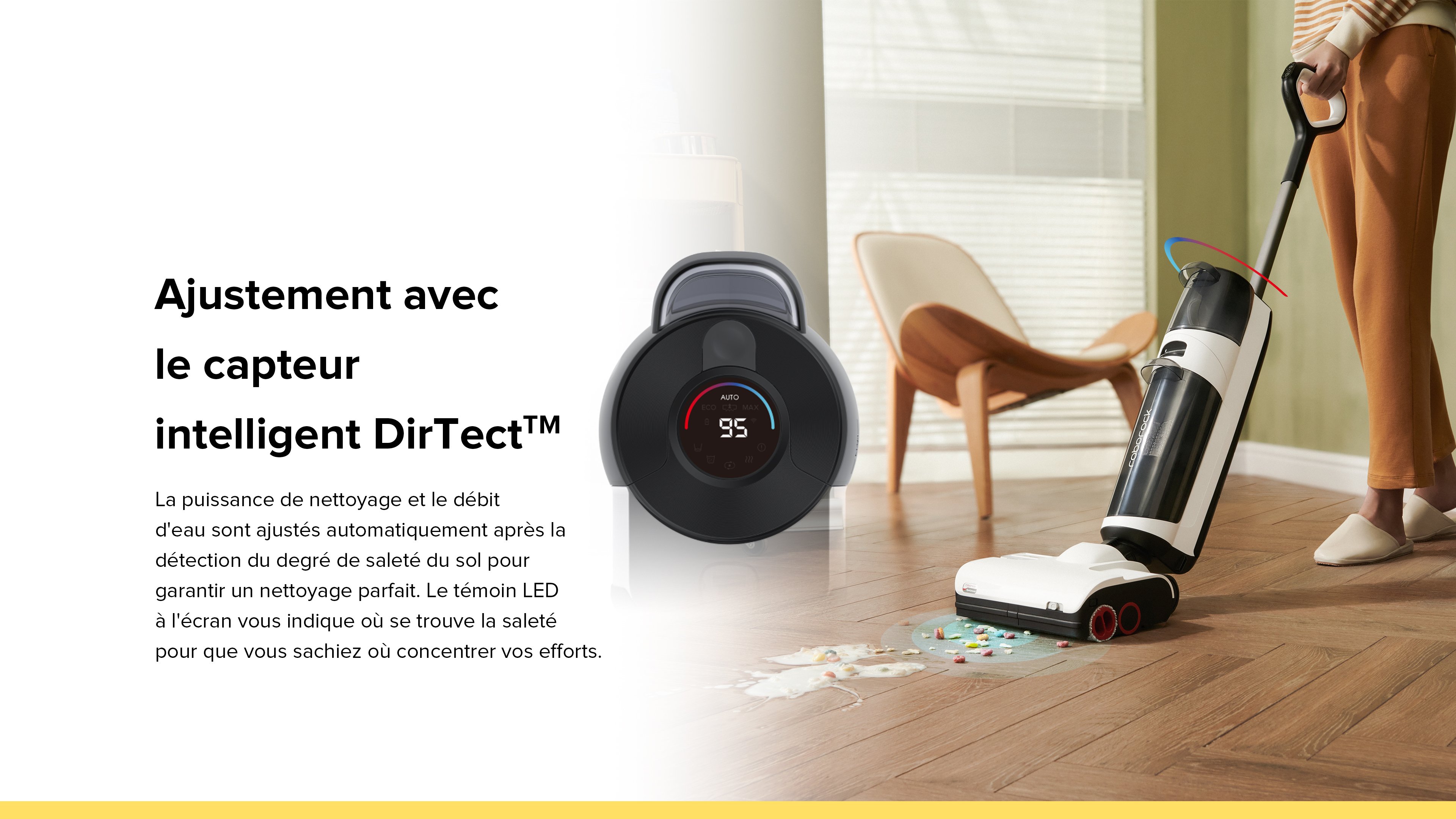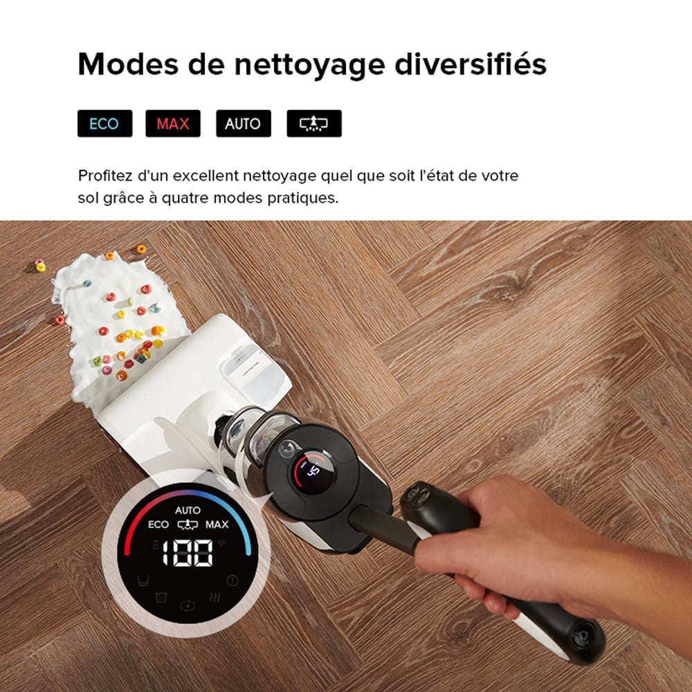 - Mode Auto : Le débit d'eau et la puissance d'aspiration sont automatiquement adaptés à la quantité de saleté sur le sol.