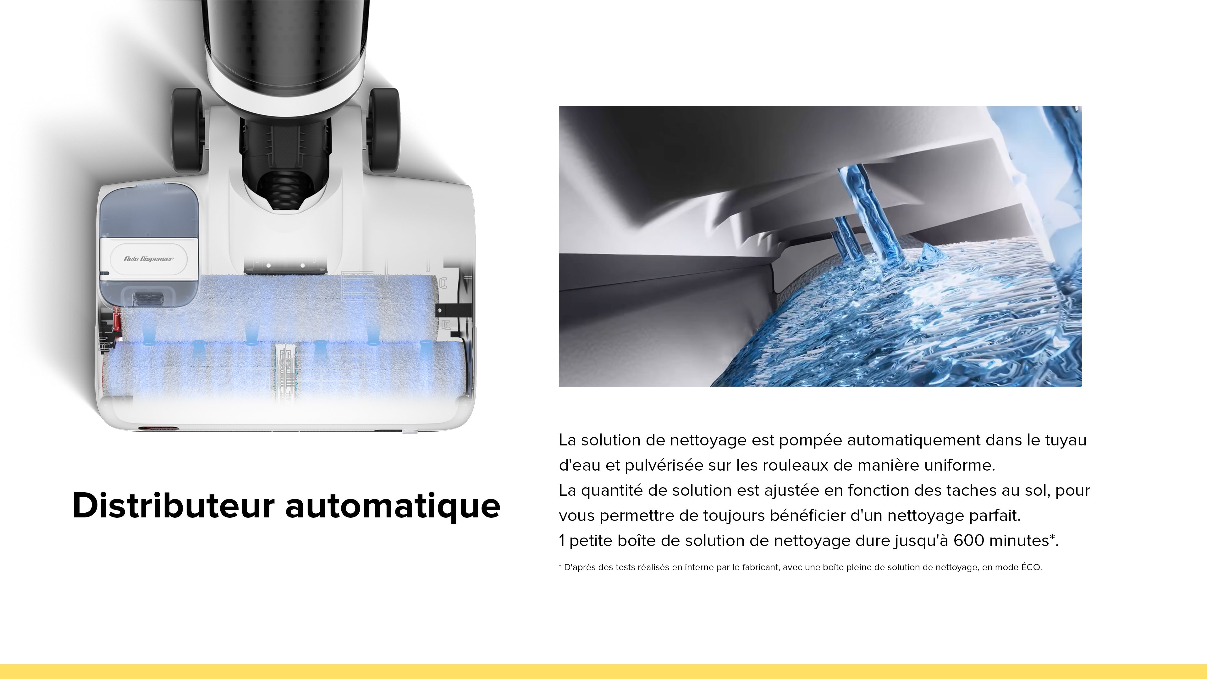 * D'après des tests réalisés en Interne par le fabricant, avec une boite plelne de solution de nettoyage, en mode ÉCO.